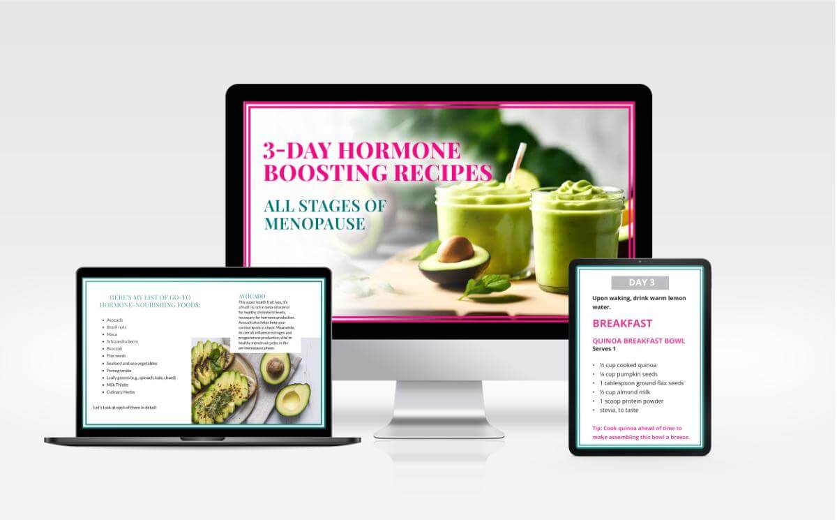 A simple strategy you can do to feel better in menopause is to eat foods that nourish your hormones. In this 3-day hormone-boosting recipe guide, you will know the foods to eat, the foods to avoid, and three days of hormone-boosting recipes. Plus, a food journal that can help you figure out the foods that don’t support your hormone health.