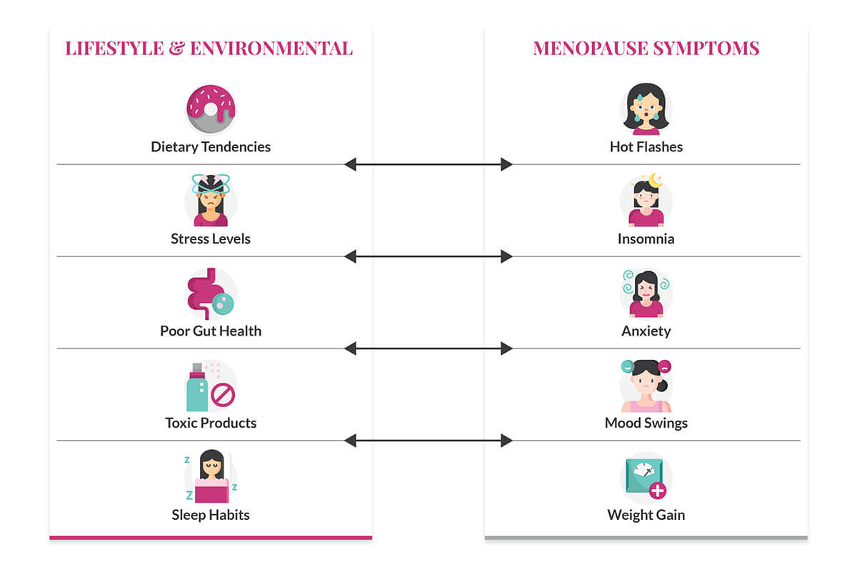 The biological changes in menopause make your body more vulnerable to lifestyle and environmental factors. Therefore, the type, frequency, and severity of symptoms you experience are often triggered or influenced by your sleep habits, dietary tendencies, stress levels, choice of products consumed or used, etc.