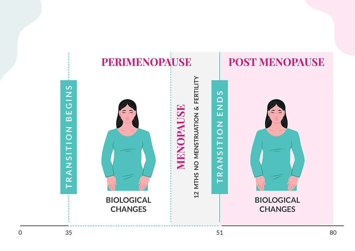 The beginning phase of the transition is known as perimenopause. On average, this begins in the late 30s to early 40s. During this time, the reproductive hormones, estrogen and progesterone, become unstable, which triggers new changes in the menstrual cycle and flow and possibly other noticeable changes in well-being, aka menopause symptoms. Perimenopause lasts until menopause. Menopause is marked by the cessation of your period, indicating that fertility has ended. On average, this occurs at age 51. The years after are the post-menopause years or the non-reproductive life stage. The transition duration and experience are unique to each woman.