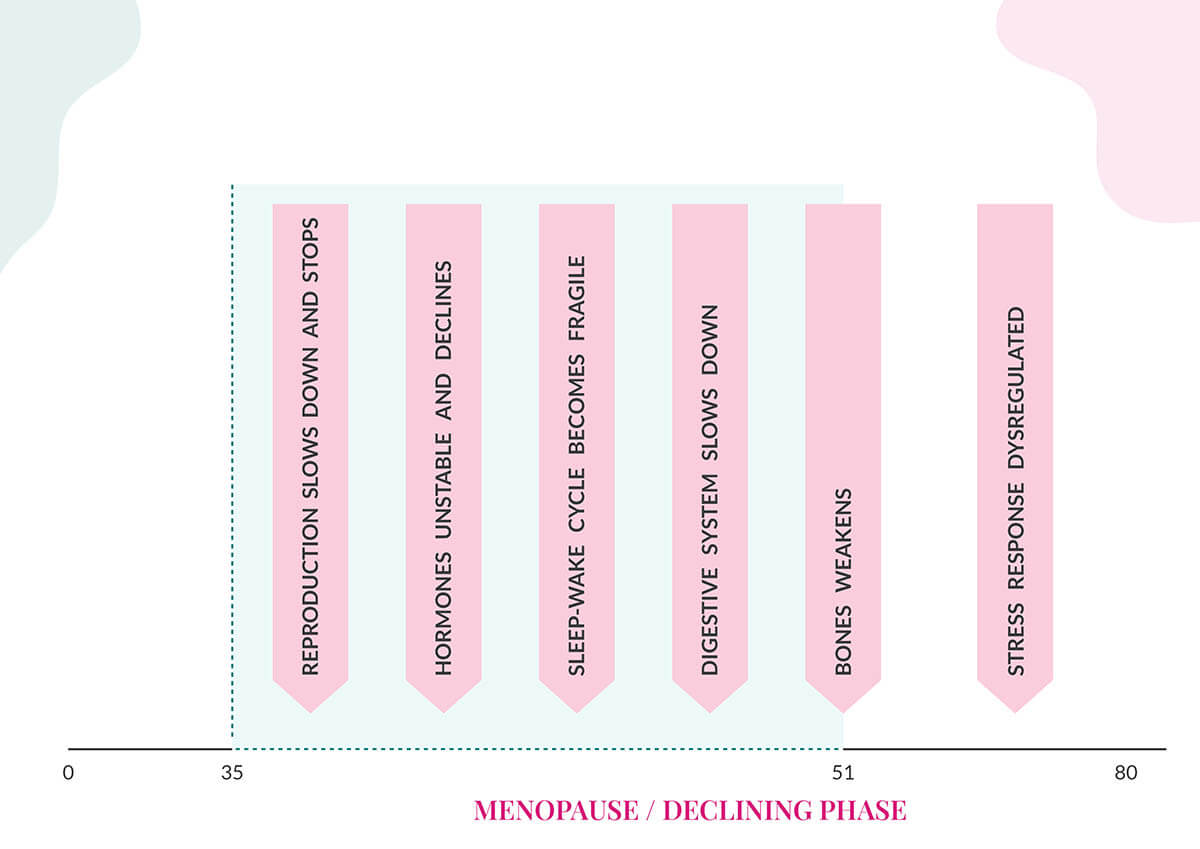 As part of the aging process, the human body—by design—goes through various biological transitions and menopause is one of them. By midlife (35-51), the menopause transition occurs that marks the end of reproduction. The reproductive system that started in puberty reaches its maturation, resulting in the decline of the reproductive hormones, estrogen and progesterone, leading to the end of menstruation and fertility. This signals the end of the reproductive life stage and the start of the non-reproductive life stage.